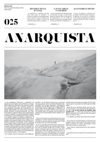 Número 025 Marzo - 2025 Editorial Futuro incierto Las palabras y los ríos Régimen Penal Juvenil Sobre complices, traidores y canallas. Algo habrán hecho Nuestro hemisferio Los anarquistas han olvidado sus principios Descargar PDF